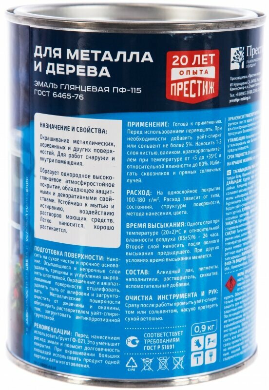 Эмаль ПФ-115 для металла и дерева Престиж, алкидная, глянцевая, 0,9 кг, синяя, 1шт, металлическая банка