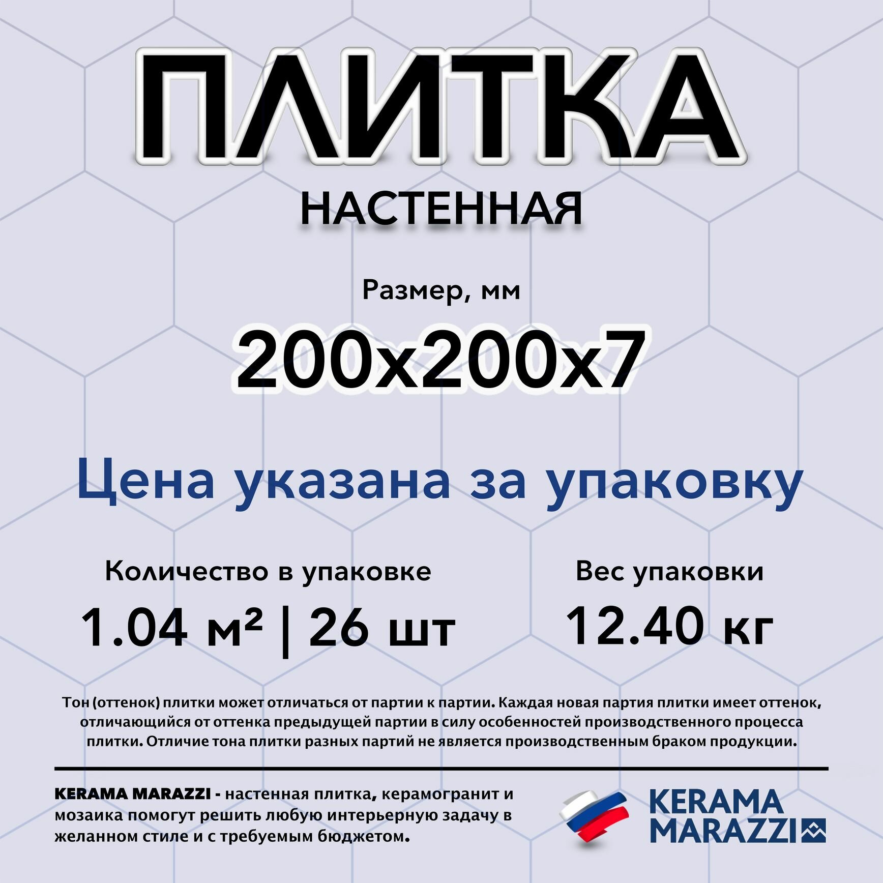 | Дополнительная информация | тон (оттенок) плитки может отличаться от партии к партии; каждая новая партия плитки имеет оттенок, отличающийся от оттенка предыдущей партии в силу особенностей производственного процесса плитки; отличие тона плитки разных партий не является производственным браком продукции |