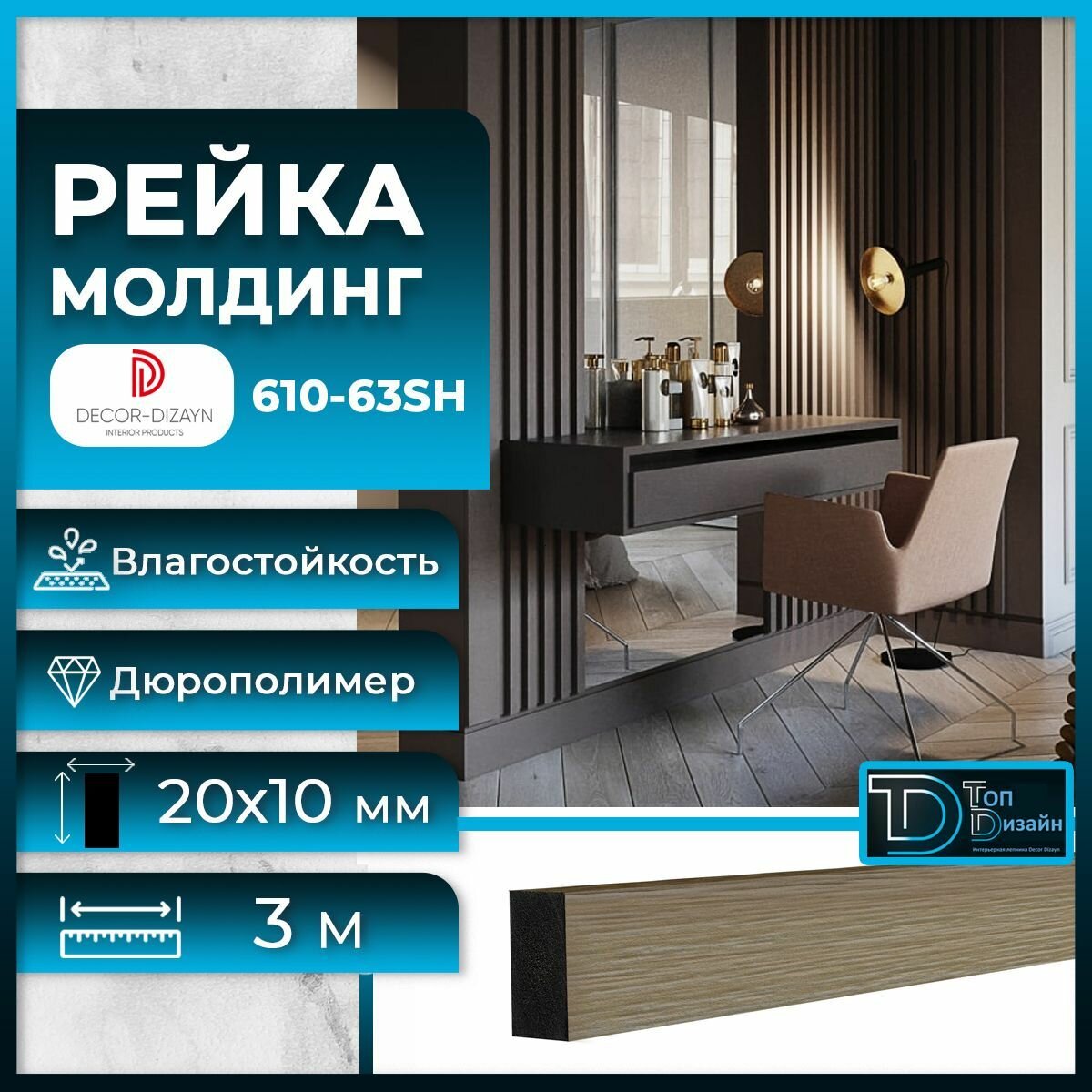 Молдинг Decor-Dizain DD610-63SH, влагостойкий, из дюрополимера, 3 метра, 1 шт.