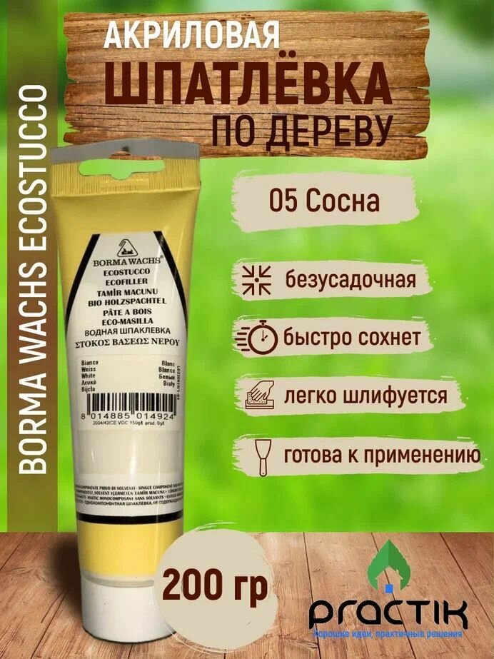 Шпаклёвка по дереву акриловая Borma Wachs Ecostucco 200гр, Сосна 05, Быстро сохнет, легко шлифуется.