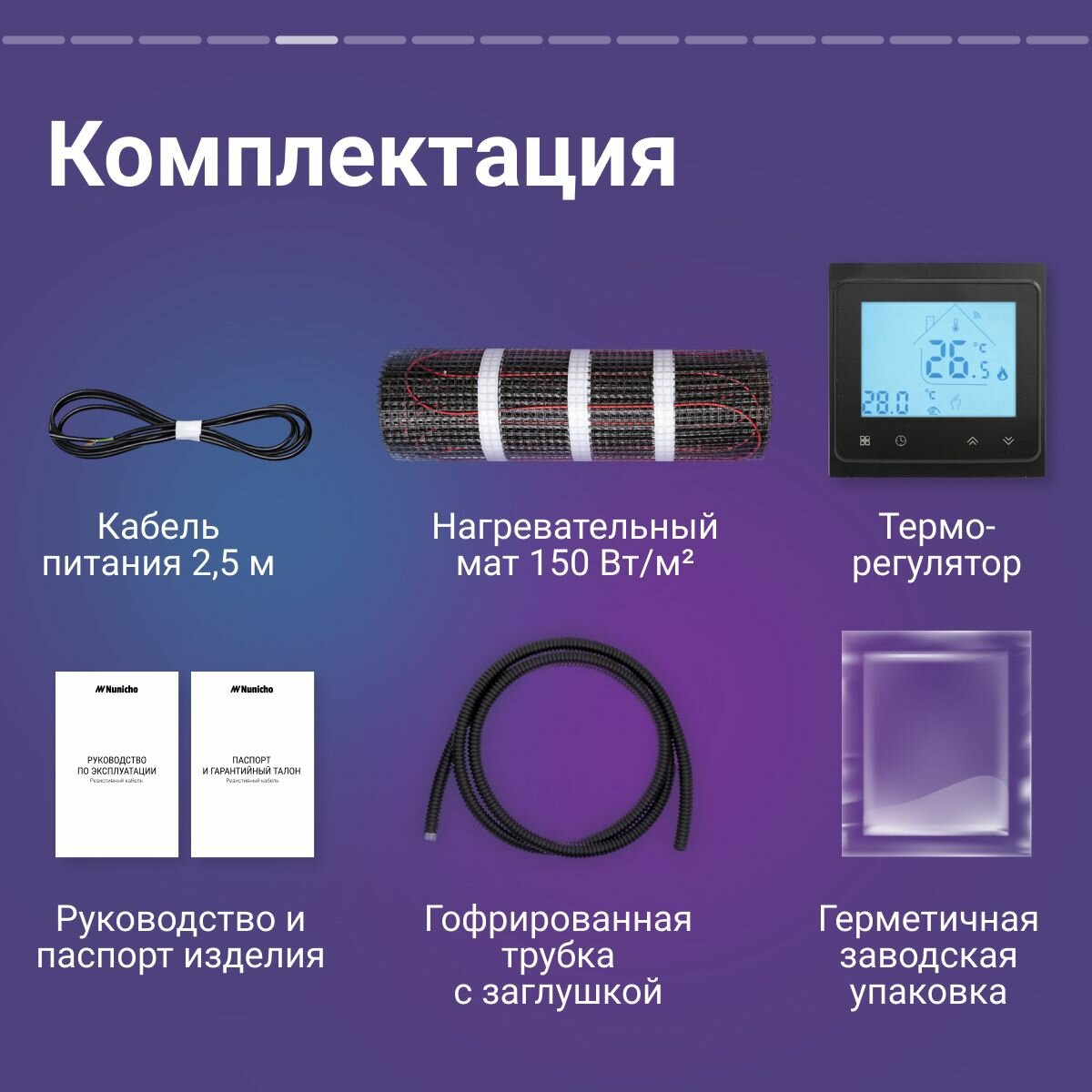 Теплый пол электрический под плитку 1 м2 Nunicho 150 Вт/м2 с Wifi терморегулятором черным, нагревательный мат