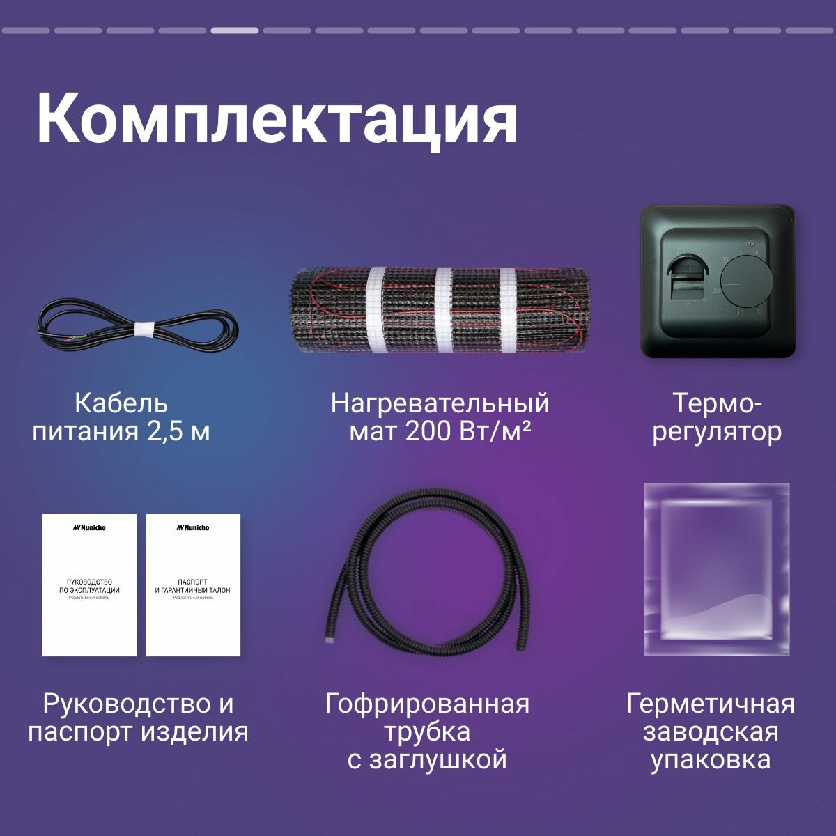 Теплый пол электрический под плитку 10 м2 Nunicho 200 Вт/м2 с терморегулятором механическим черным, нагревательный мат
