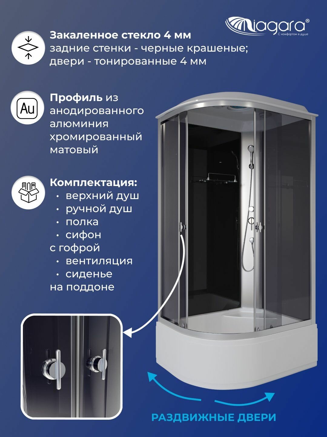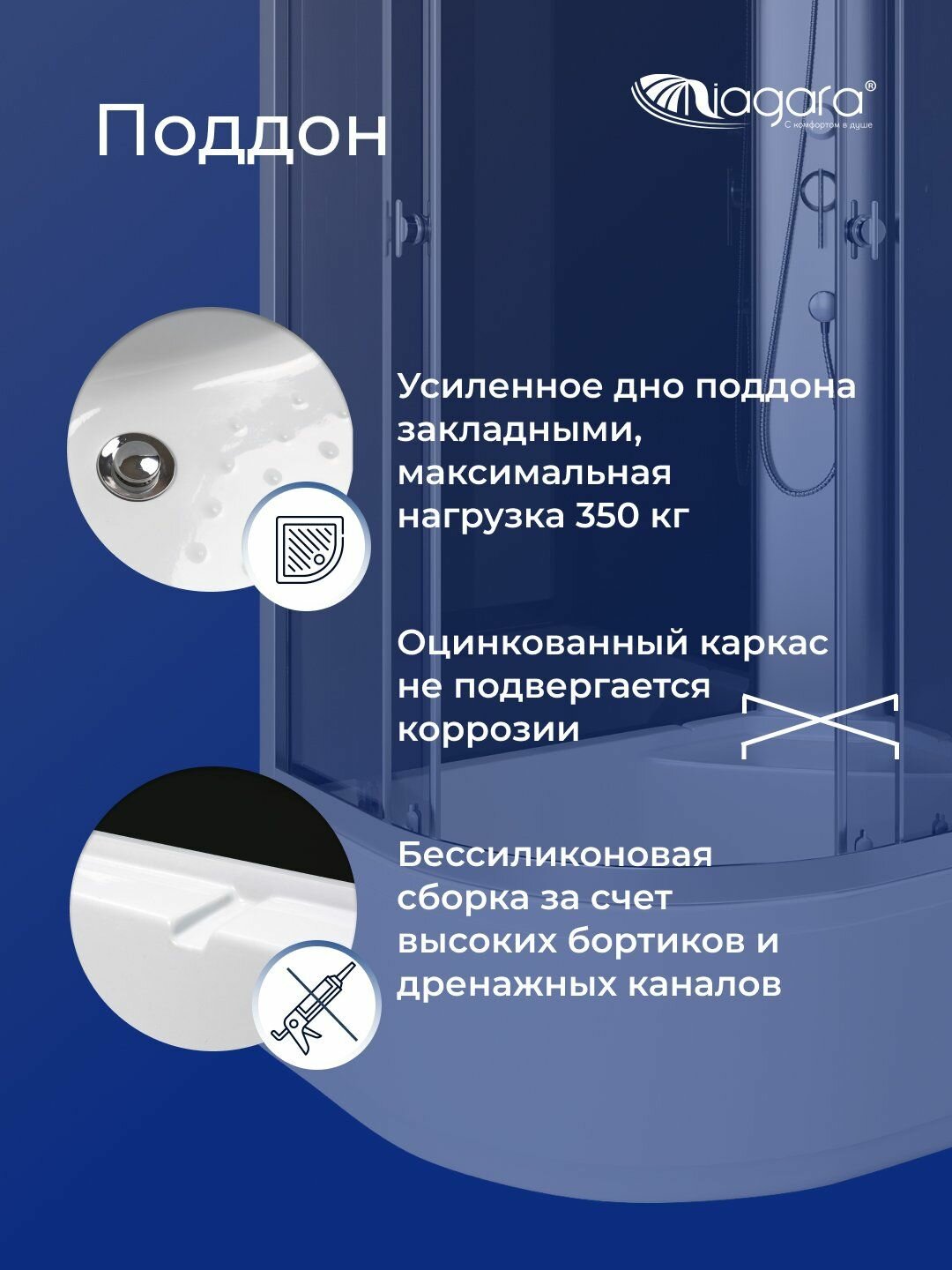 | Комплектация | душевая лейка, поддон, полки |