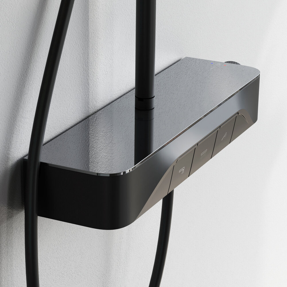 Душевая система с тропическим душем AM.PM Func смесителем черная матовая, с полкой, с изливом, телескопическая штанга