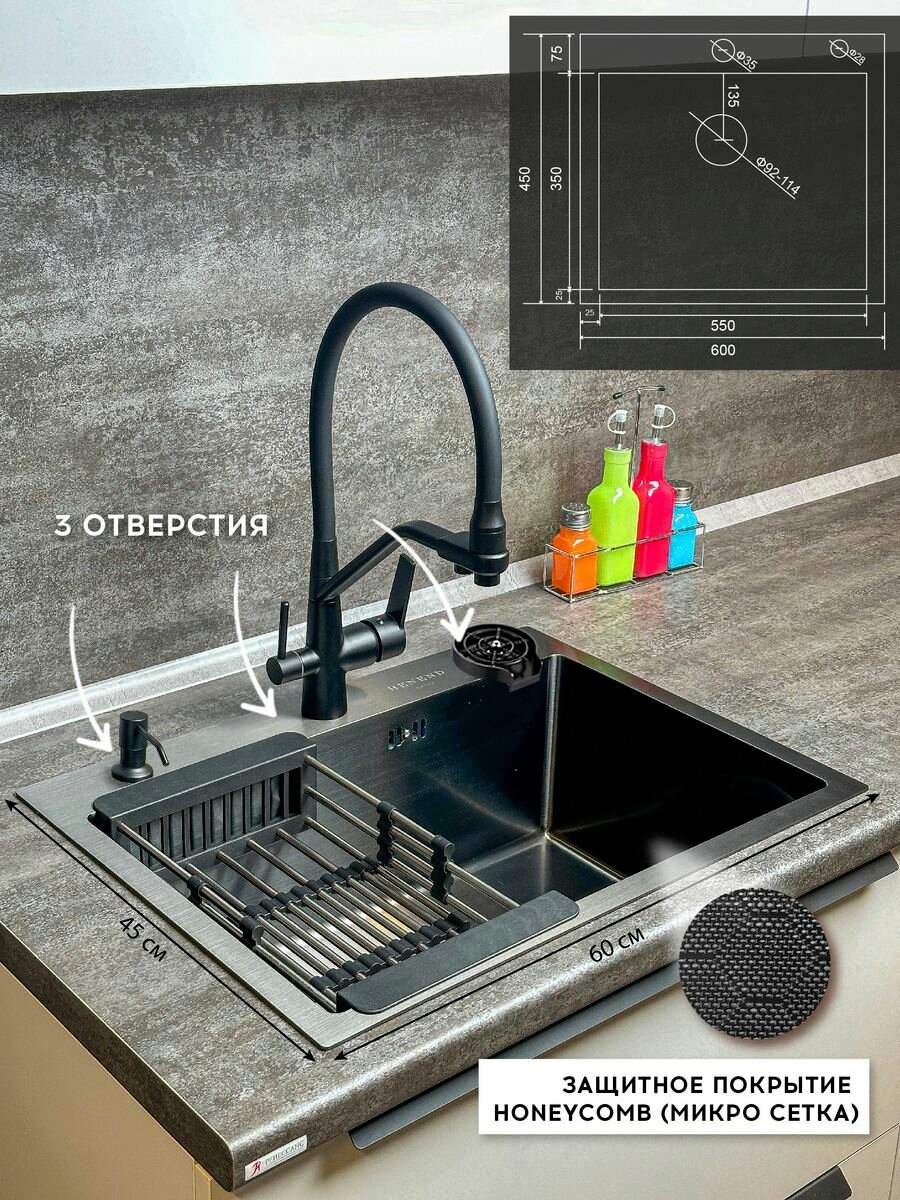 Мойка для кухни Henend 60x45B с дозатором и сушилкой