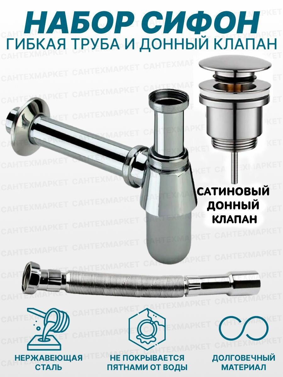 Сифон для раковины с гибкой трубкой Хром и донный клапан Сатин интересное: