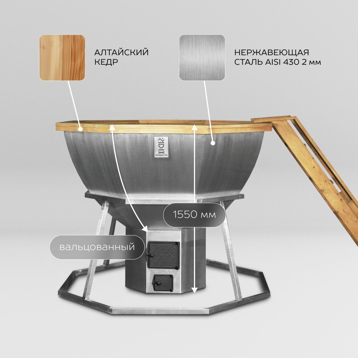 | Подробная комплектация | чан - 1 шт., лестница - 1 шт., опора - 1 шт., дымоход - 1 шт. |