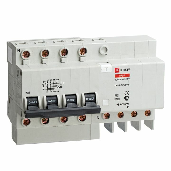 Автомат дифференциальный EKF PROxima АД-4 63А 30 мА 4P тип AC 4,5 кА (DA4-63-30-pro)
