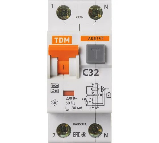 Купить АВДТ 63 2Р(1Р+N) C32 30мА 6кА тип А - Автоматический Выключатель Дифференциального тока TDM SQ0202-0005 (1 шт.)
