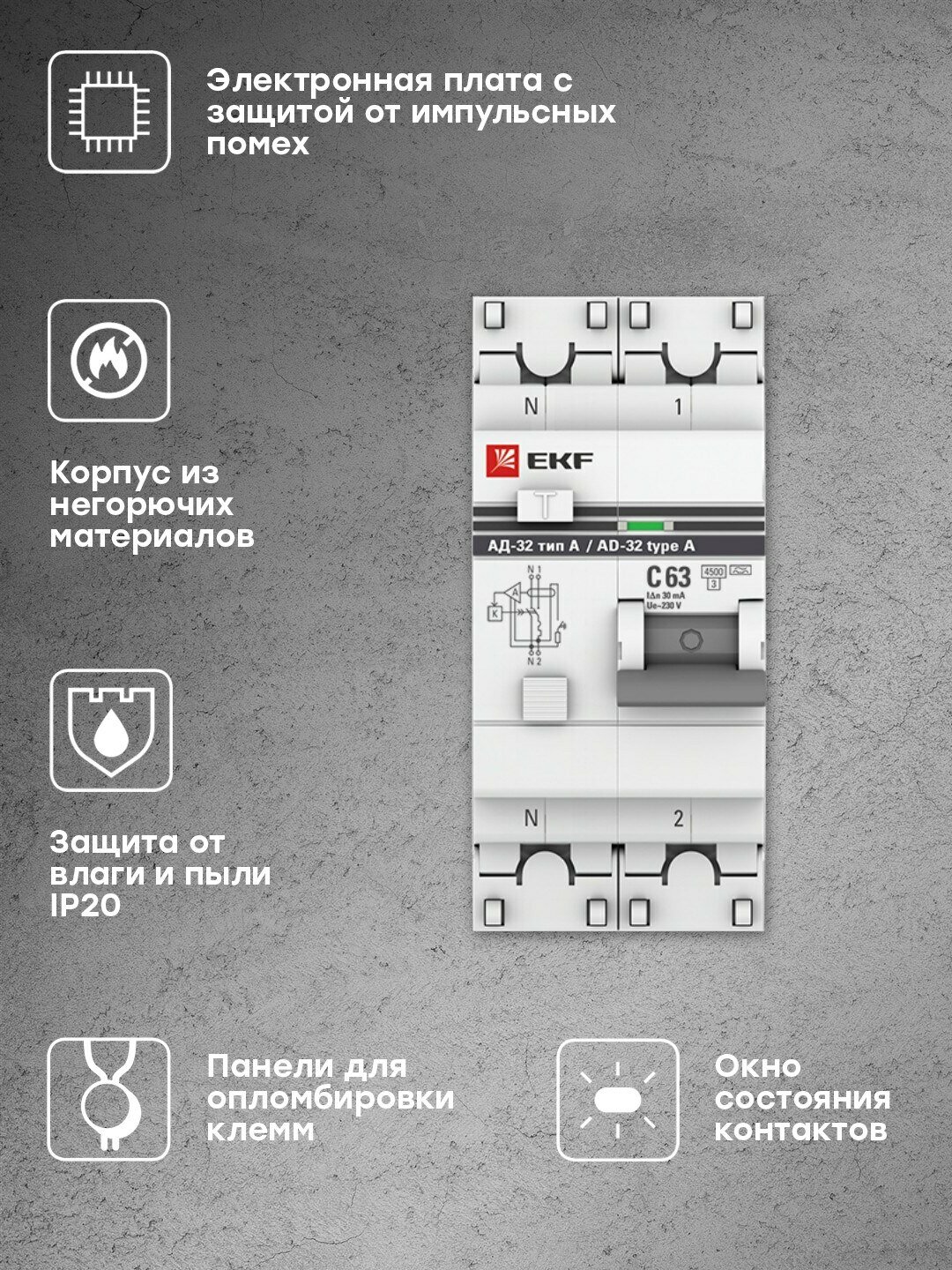 Купить EKF Дифференциальный автомат АД-32 1P N 63А/30мА тип А PROxima DA32-63-30-a-pro