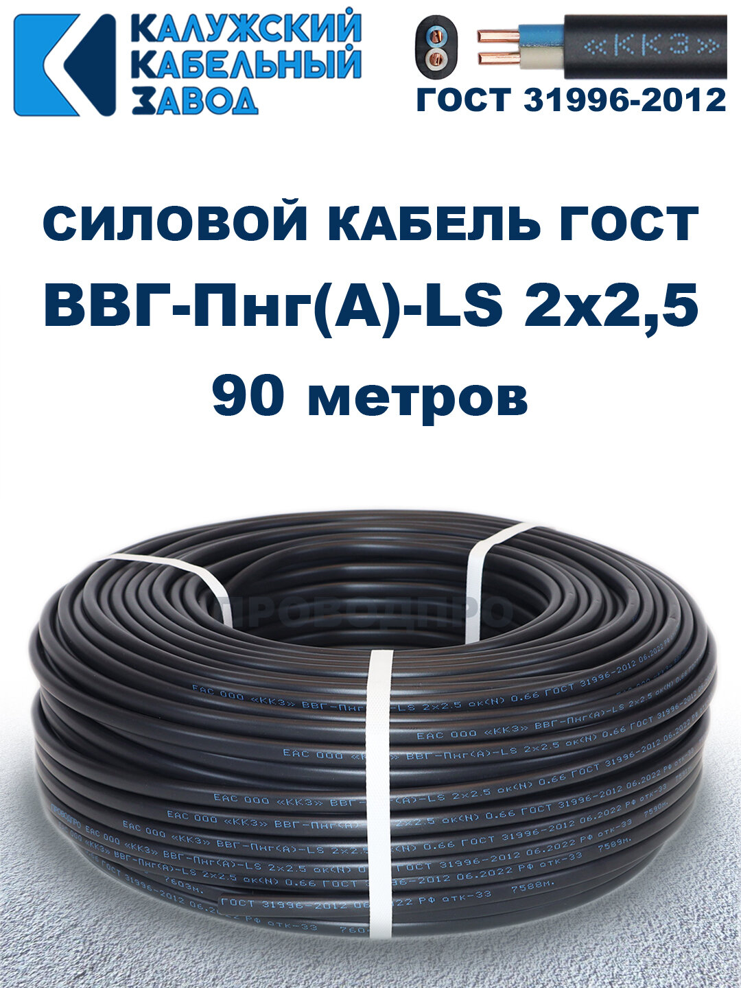 Купить Кабель силовой ВВГ-Пнг(А)-LS 2х2,5 ГОСТ. 90 метров. Кaлyжcкий кабельный зaвoд