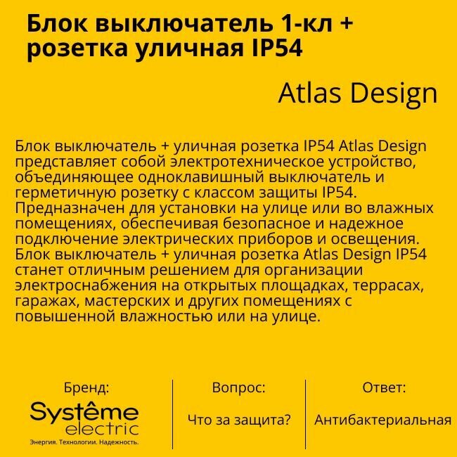 Блок выключатель + розетка уличная IP54, пылевлагозащищенная электрическая 1-клавишная Schneider Electric (Systeme Electric) Atlas Design с заземлением, с защитными шторкми, 16А, Антрацит - 1 шт.