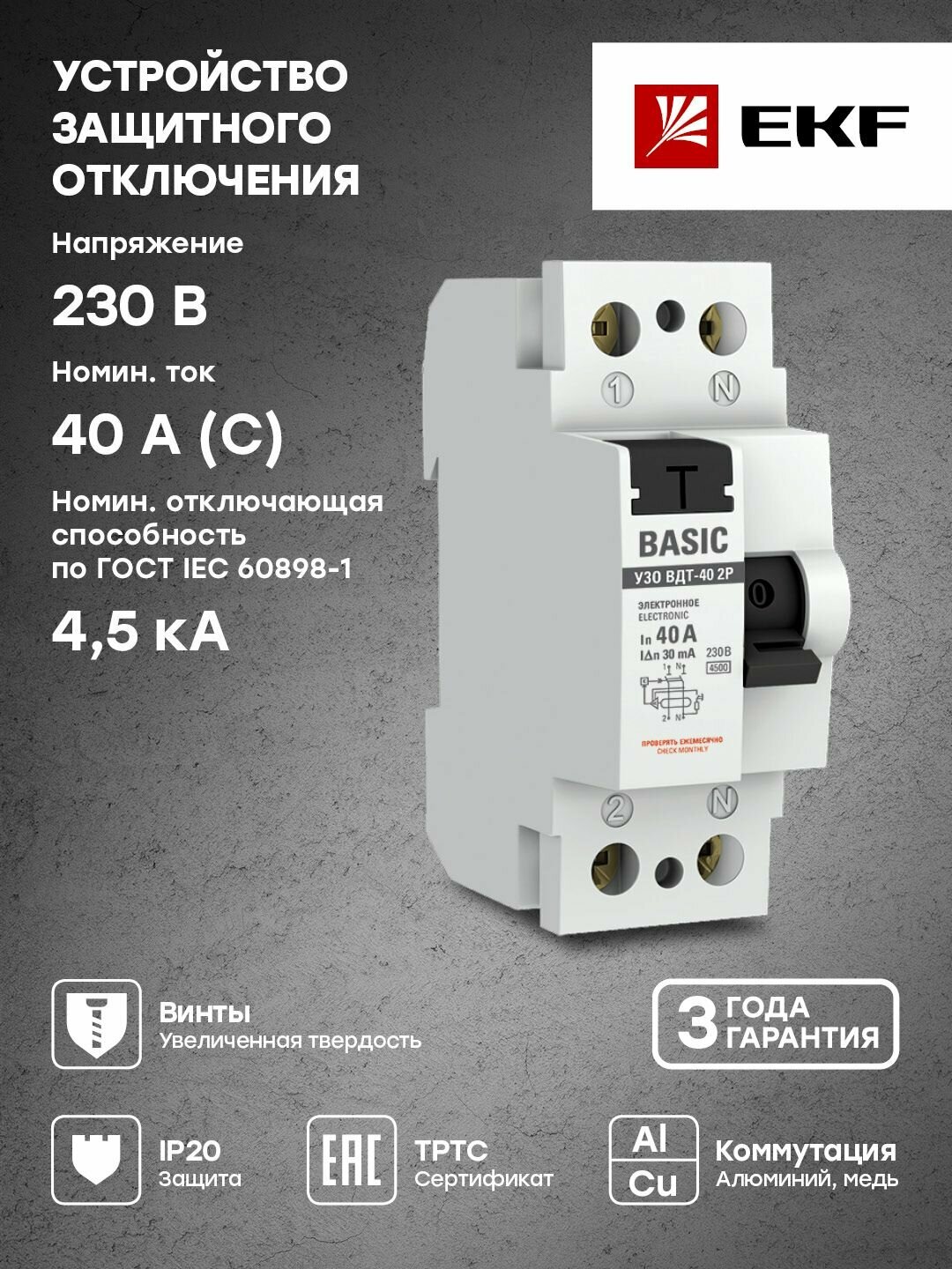 EKF Устройство защитного отключения УЗО ВДТ-40 2P 40А/ 30мА (электронное) Basic