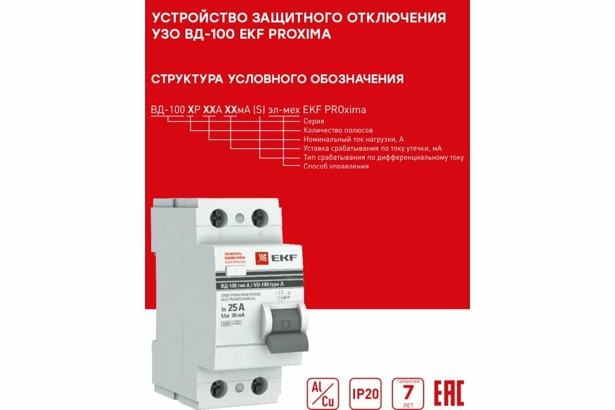 Устр-во защит. откл. (УЗО, ВДТ) 2-пол. (2P) 25А 30мА тип AC ВД-100 EKF PROxiмА