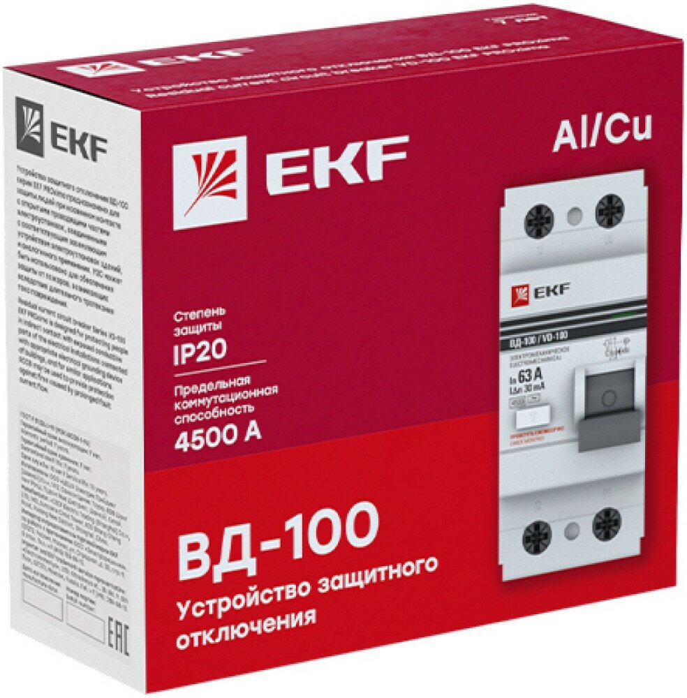 Устройство защитного отключения УЗО ВД-100 2 полюса, 63А, Тип AC, 30мА | код. elcb-2-63-30-em-pro | EKF ( 1шт. )