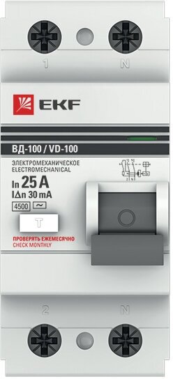 УЗО EKF ВД-100 (elcb-2-25-30-em-pro) 25А 30 мА 2P тип AC 4,5 кА