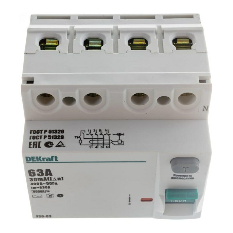 | Дополнительная информация | УЗО Dekraft 4P 63 A 30 мА 6 кА AC 14236DEK |