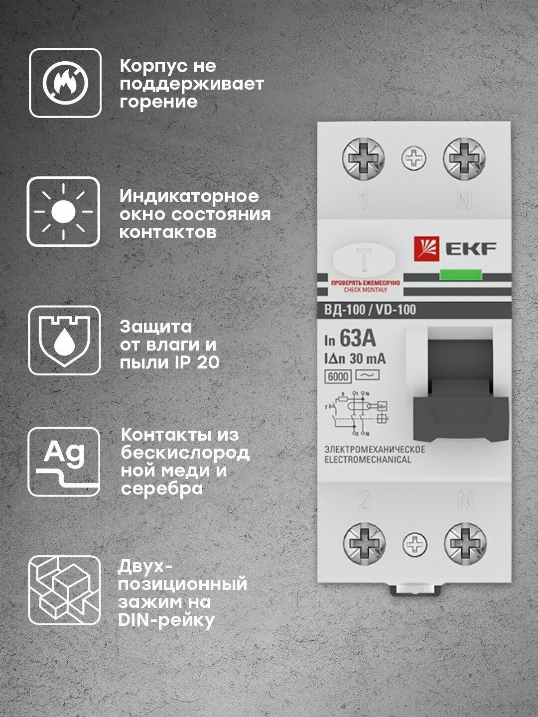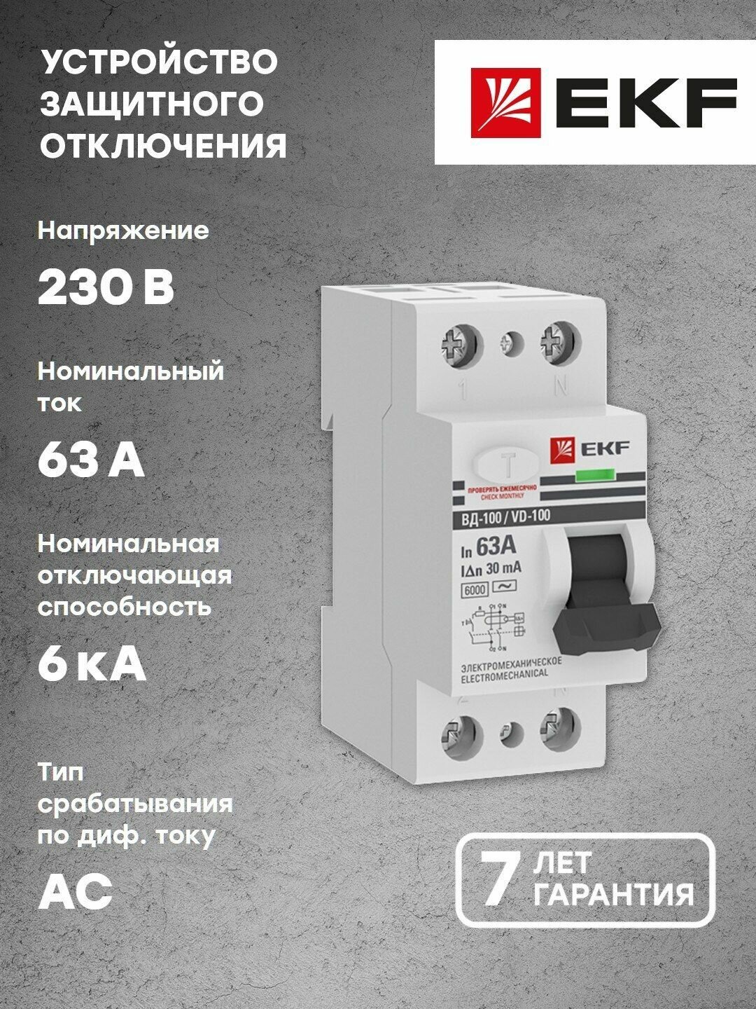 Устройство защитного отключения EKF ВД-100, 2P, 63А, 30мА, тип АС, электромеханическое, 6кА, PROxima elcb-2-6-63-30-em-pro
