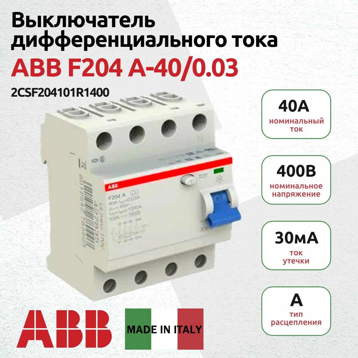 ABB F204 A-40/0,03 УЗО (ВДТ) 4-полюсное 40А 30мA тип А 10кА 2CSF204101R1400