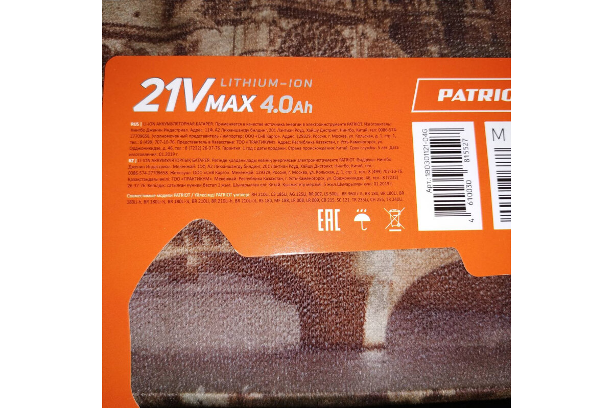 | Совместимость | Аккумуляторные инструменты, оснащенные Patriot UES напряжением 18 - 21 В. |