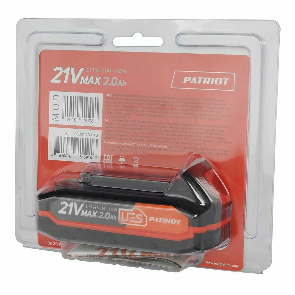 | Совместимость | Аккумуляторные инструменты, оснащенные Patriot UES напряжением 18 - 21 В. |