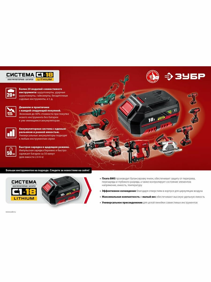 Аккумуляторная батарея ЗУБР 18В 2 Ач Li-Ion тип С1 (АКБ-С1-18-2)