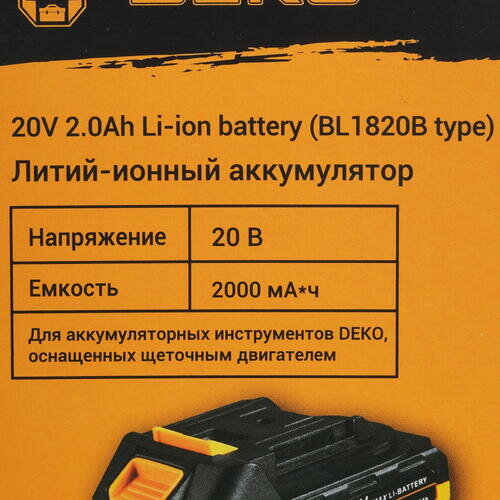 Аккумулятор DEKO (тип BL1820B), Li-ion, 20В, 2.0А*ч