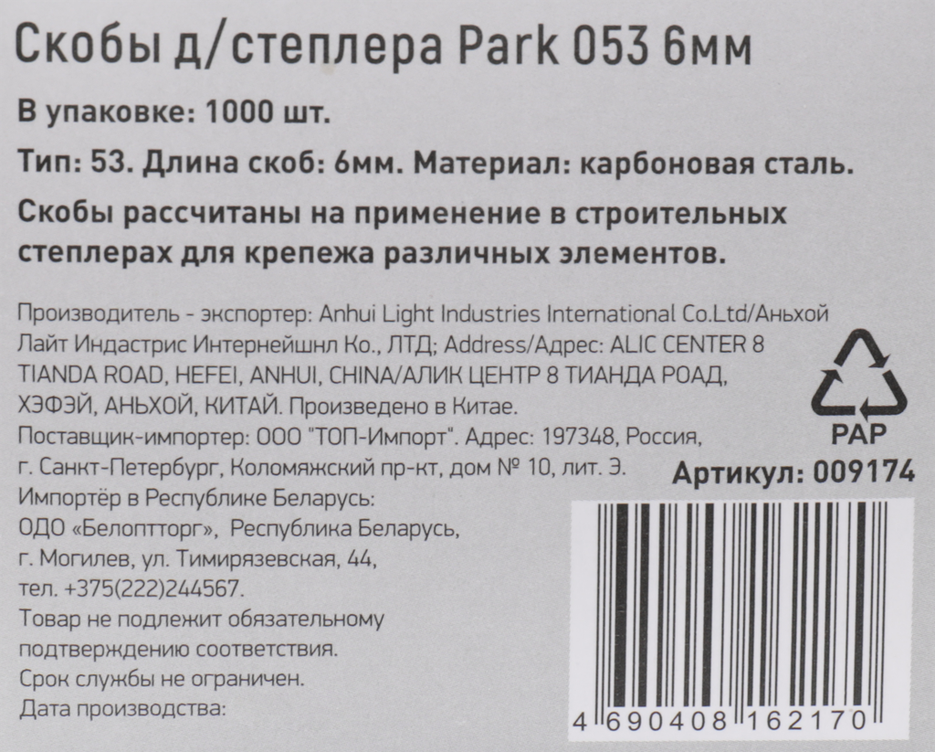 Купить Скобы д/степлера Park 053 6мм 1000 шт