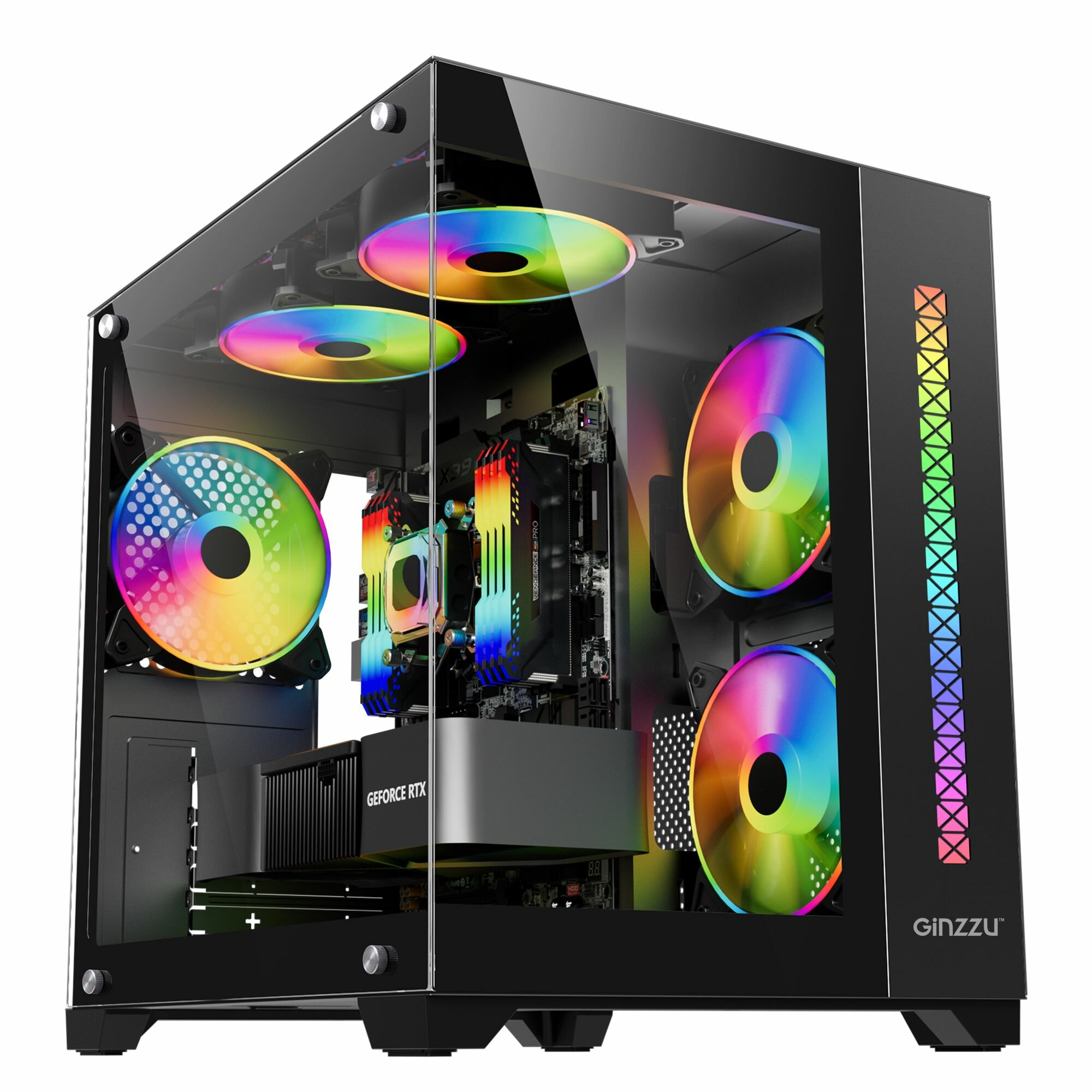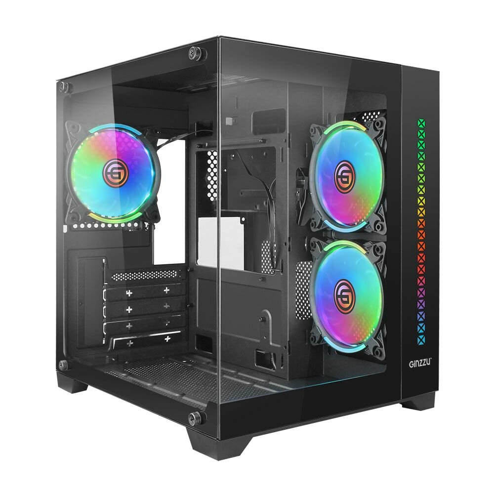 Корпус Ginzzu V490 mATX кубик, закаленное стекло, RGB подсветка, система охлаждения