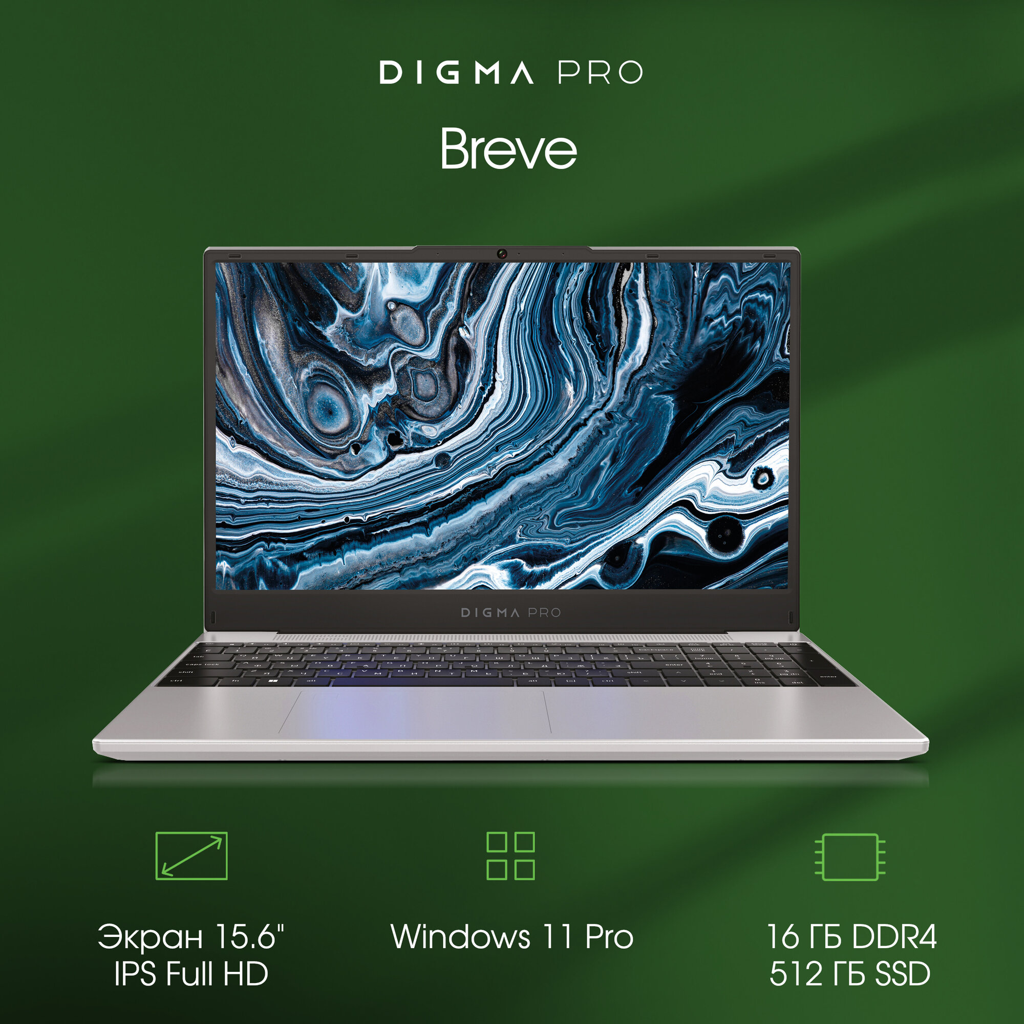 Ноутбук DIGMA PRO Breve DN15R5-8DXW03, 15.6", IPS, AMD Ryzen 5 5500U 2.1ГГц, 6-ядерный, 8ГБ DDR4, 512ГБ SSD, AMD Radeon интегрированное, Windows 11 Professional, серебристый