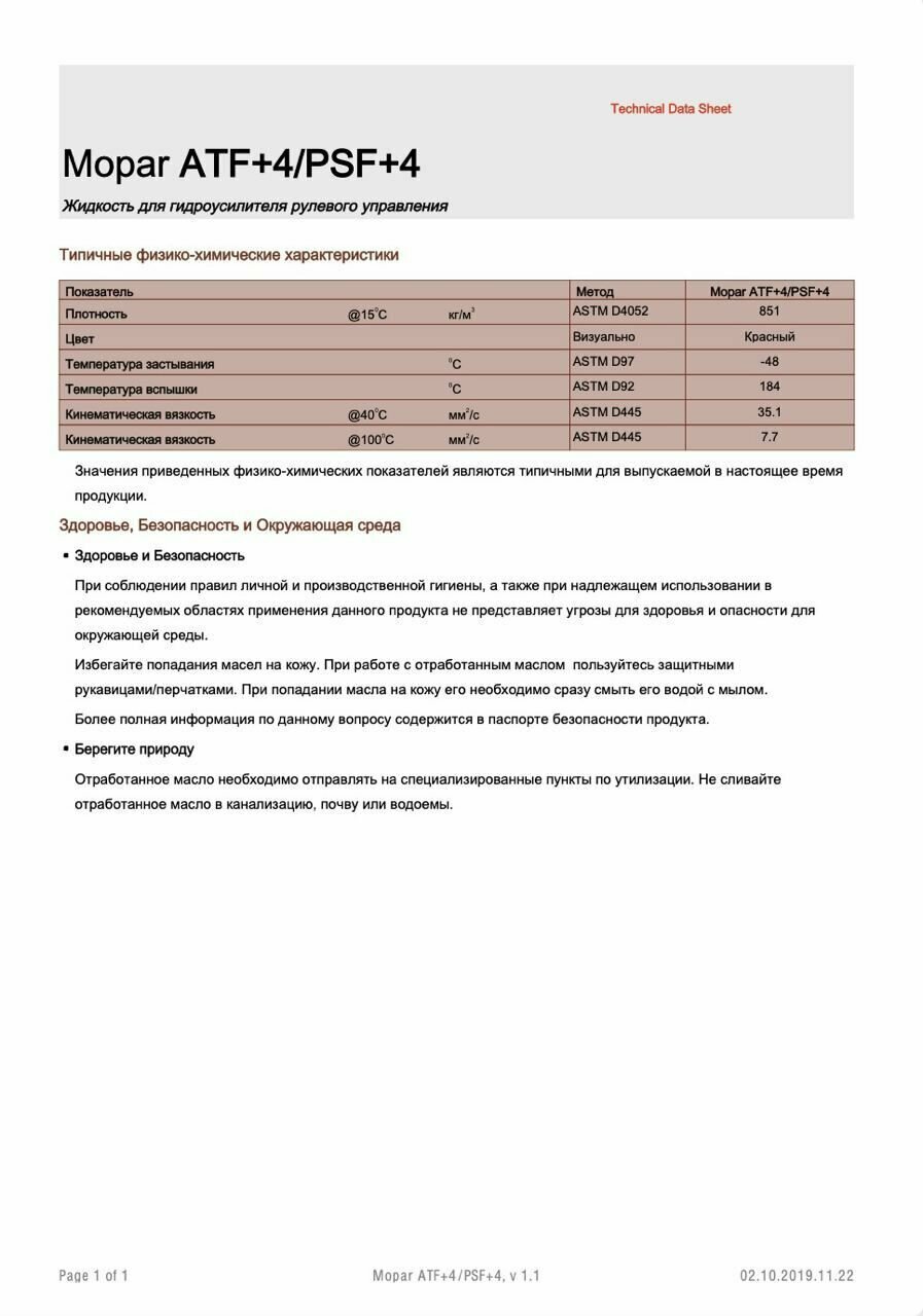 CHRYSLER MOPAR ATF+4/PSF+4 (США), (1л) + бирка, масло синтетика трансмиссионное АТФ для АКПП Мопар 68218057GE, РТЛ