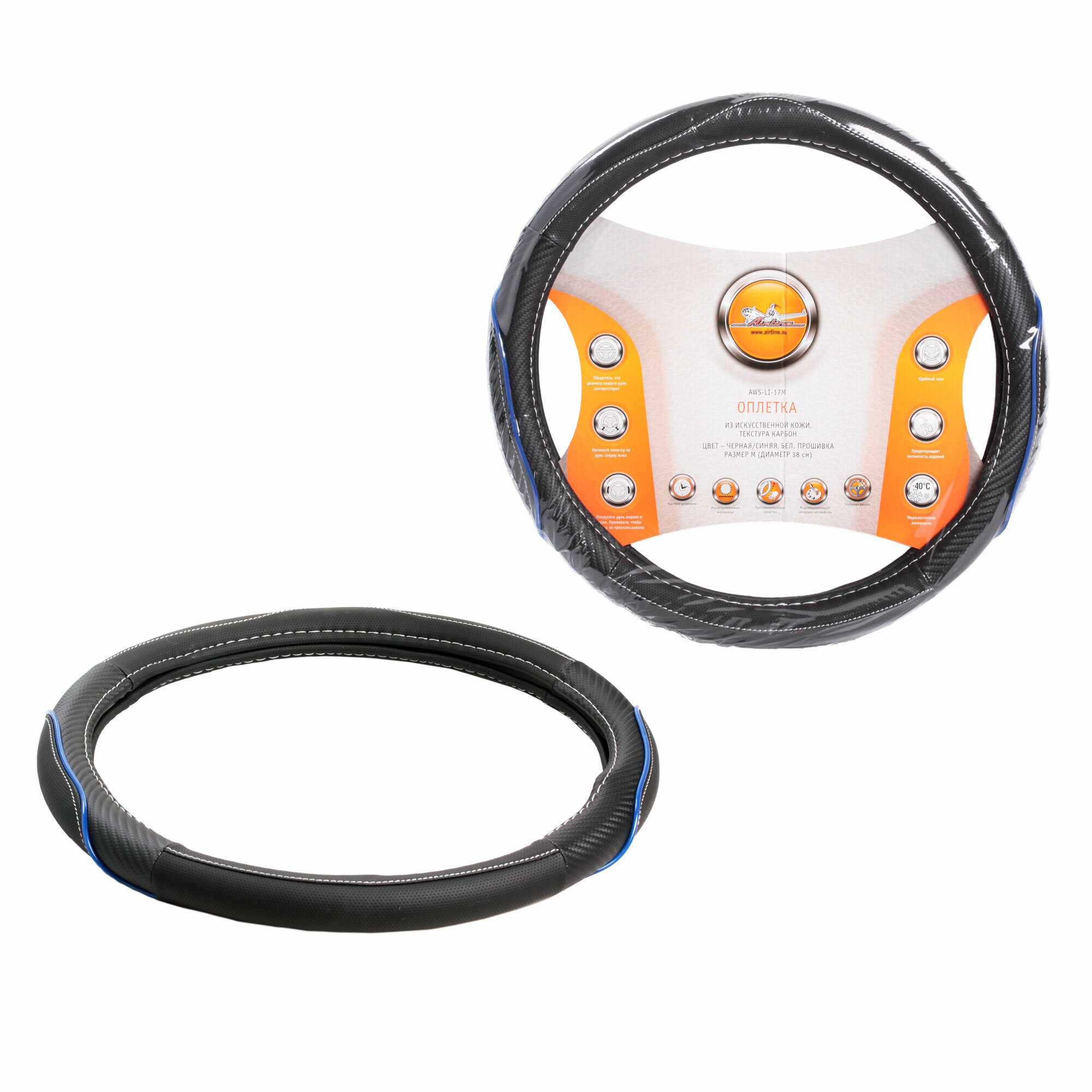 Оплетка на руль, искусст. кожа, текстура карбон, черная/синяя, бел. прошивка, 38 см/М AWS-LI-17M AIRLINE