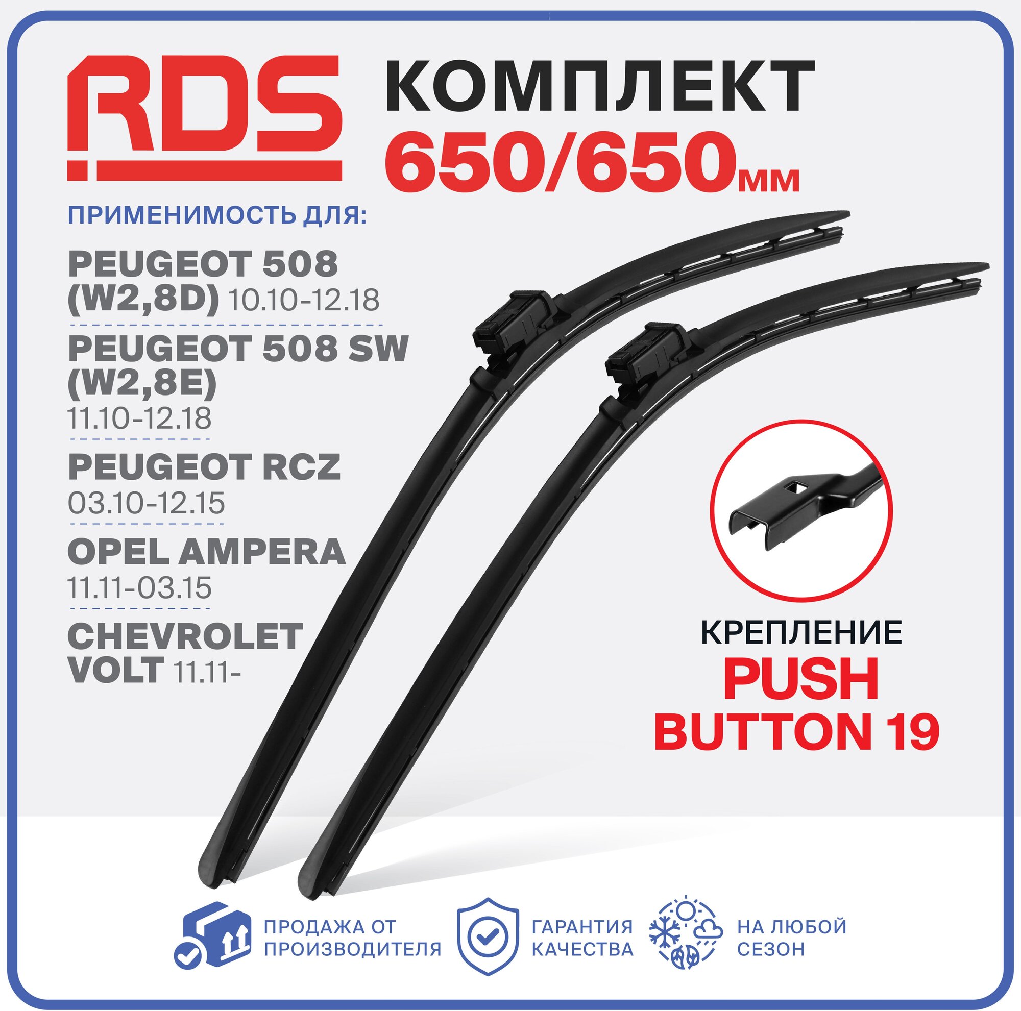 650 650 мм. Push Button 19 мм. Комплект щеток стеклоочистителя RD5 дворники Peugeot 508, 508 SW, RCZ , Chevrolet Volt Шевролет Вольт