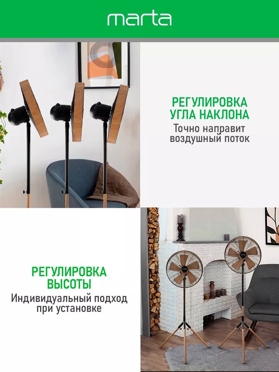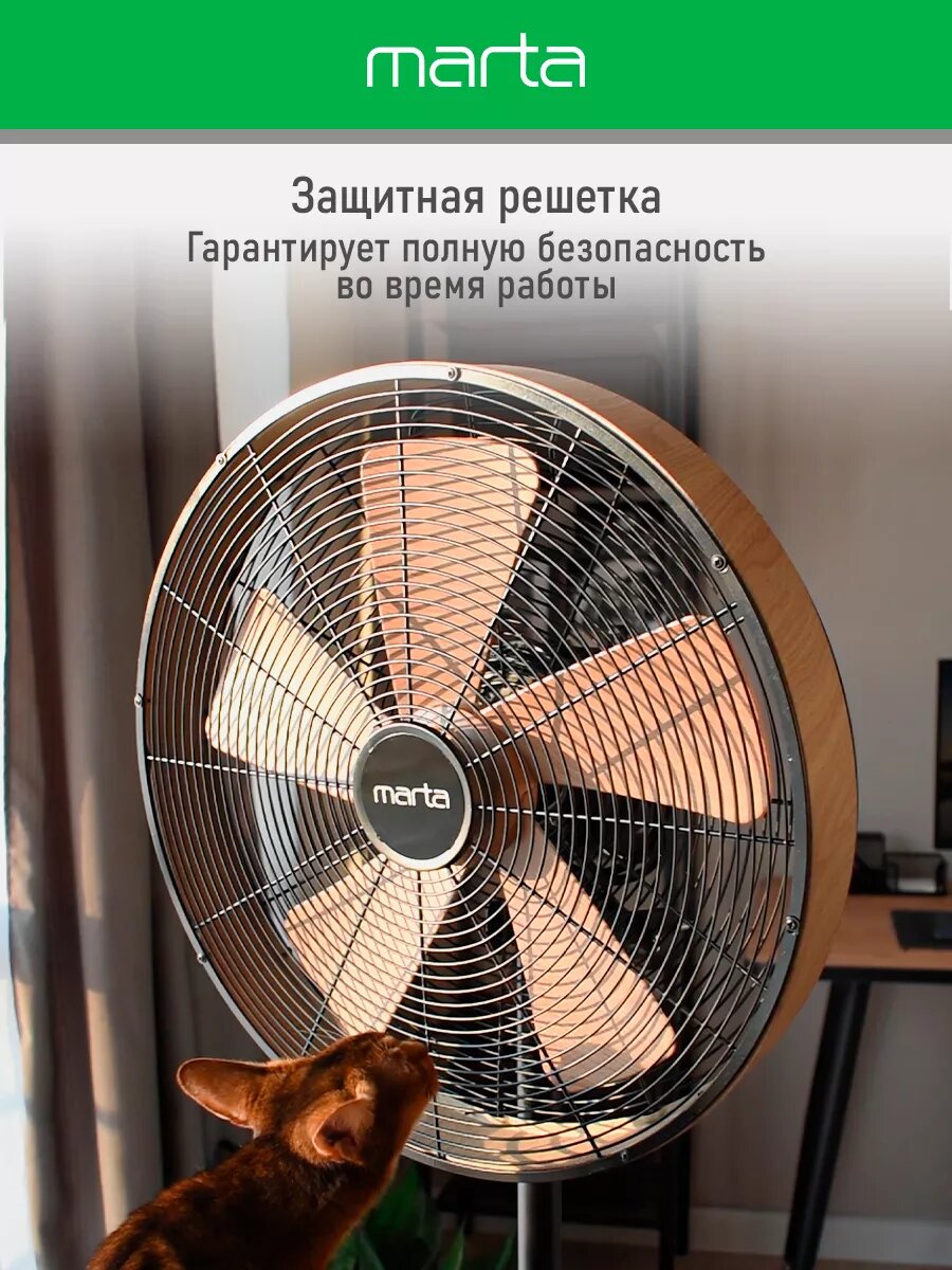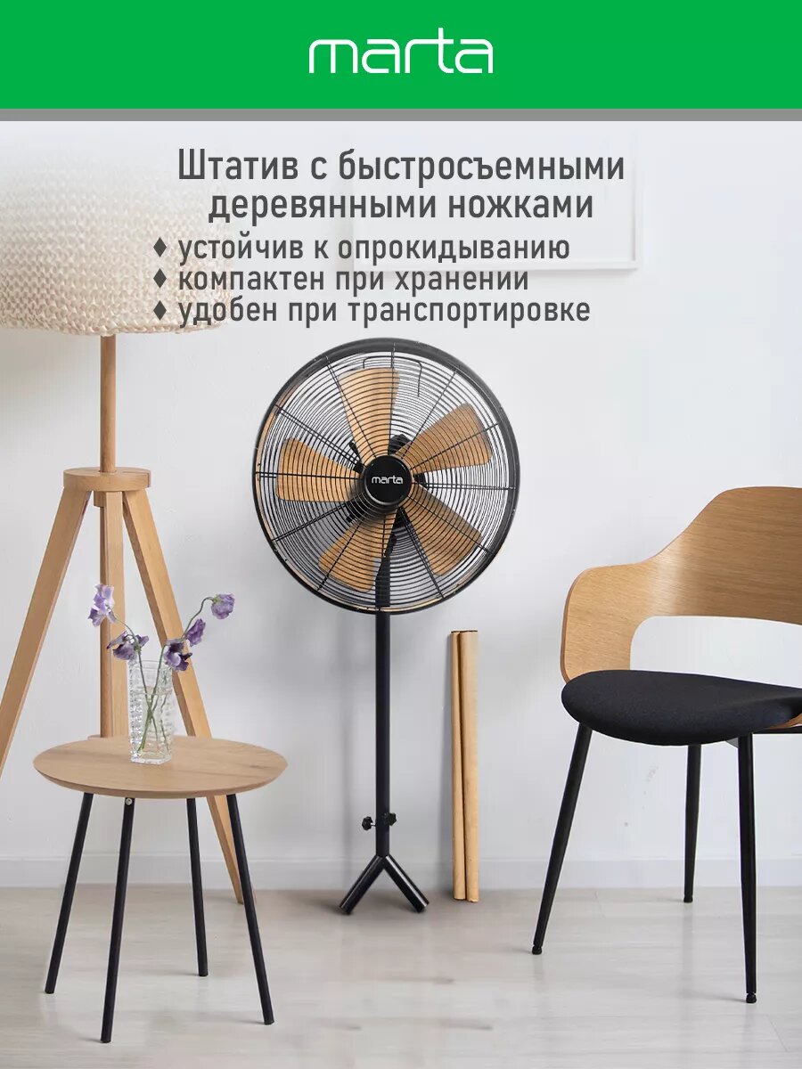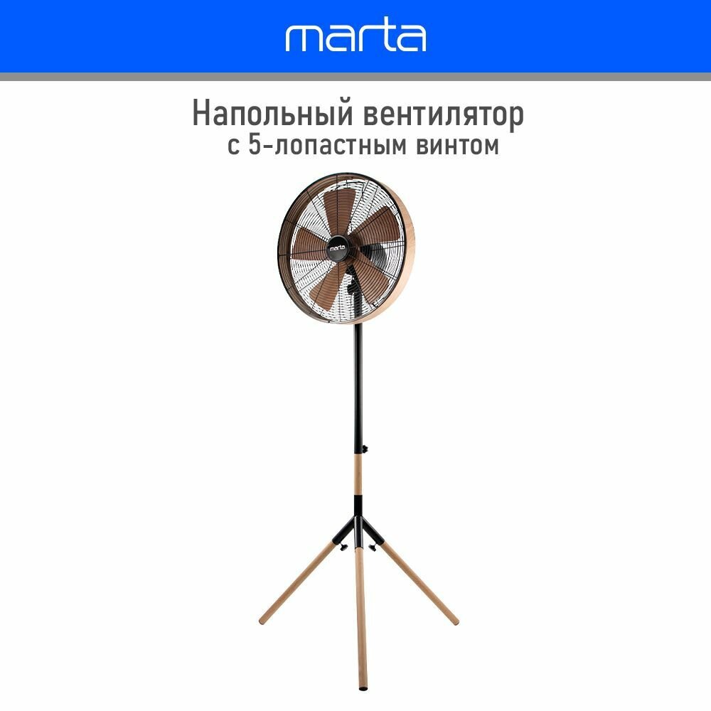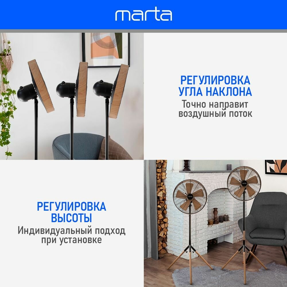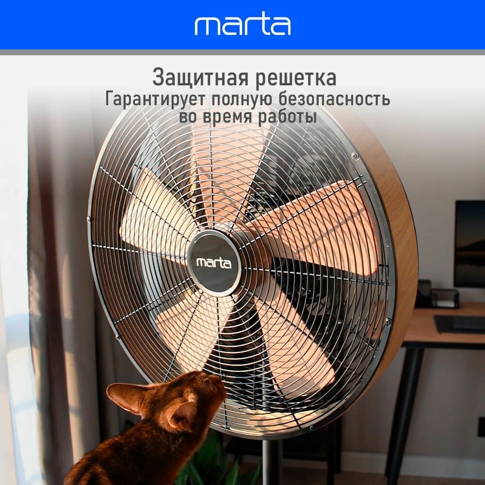 Вентилятор напольный MARTA MT-FN2555 с уникальным дизайном, d40 см, высокая мощность, регулировка угла наклона, вращение, безопасная металлическая решетка, черный/дерево