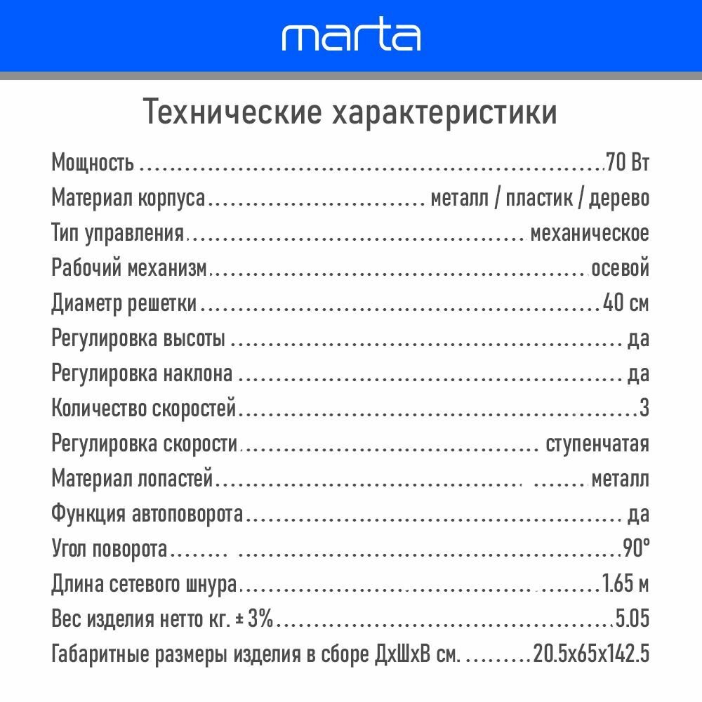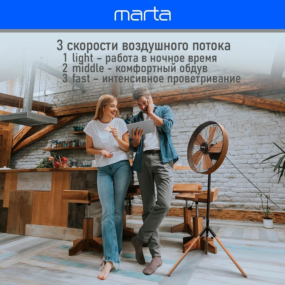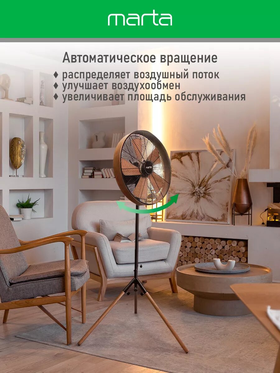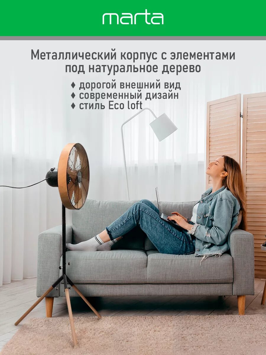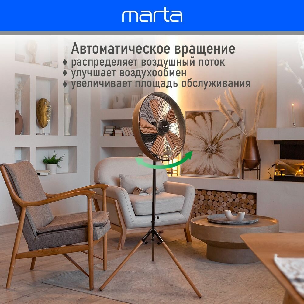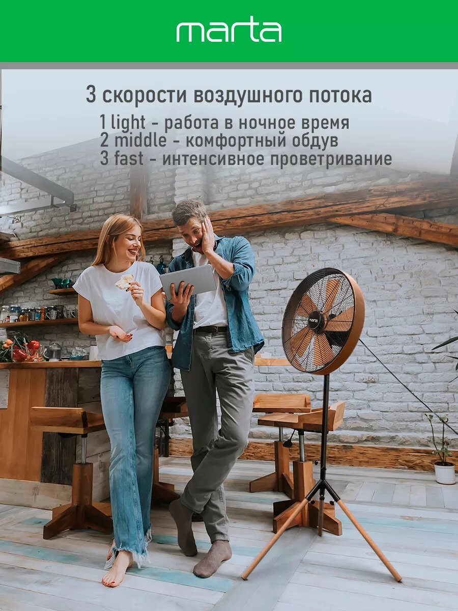 Вентилятор напольный MARTA MT-FN2555 с уникальным дизайном, d40 см, высокая мощность, регулировка угла наклона, вращение, безопасная металлическая решетка, черный/дерево