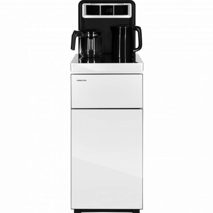 Кулер для воды HIBERG UF 95 W напольный, электронное охлаждение, столешница с двумя чайниками, нижняя загрузка бутыли, сенсорное управление, цвет белое стекло