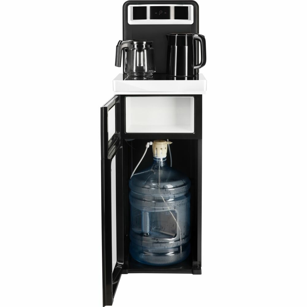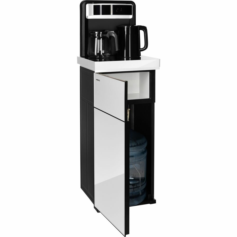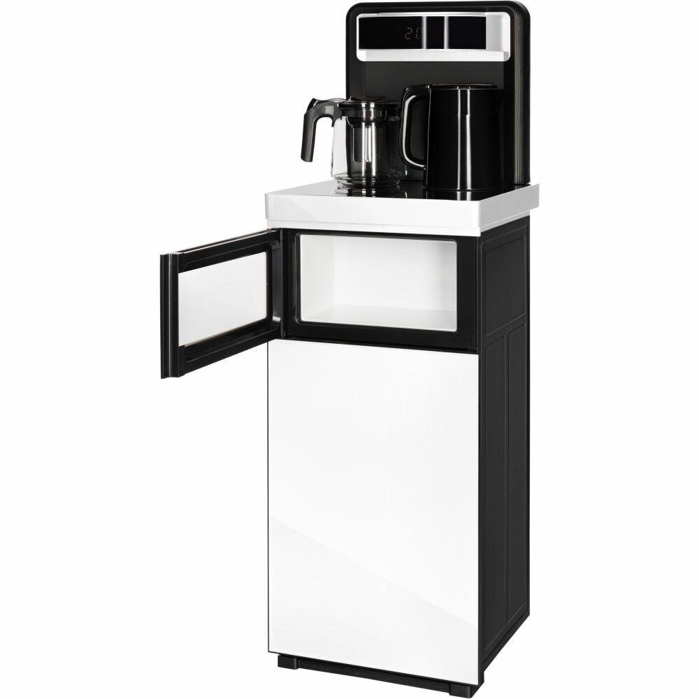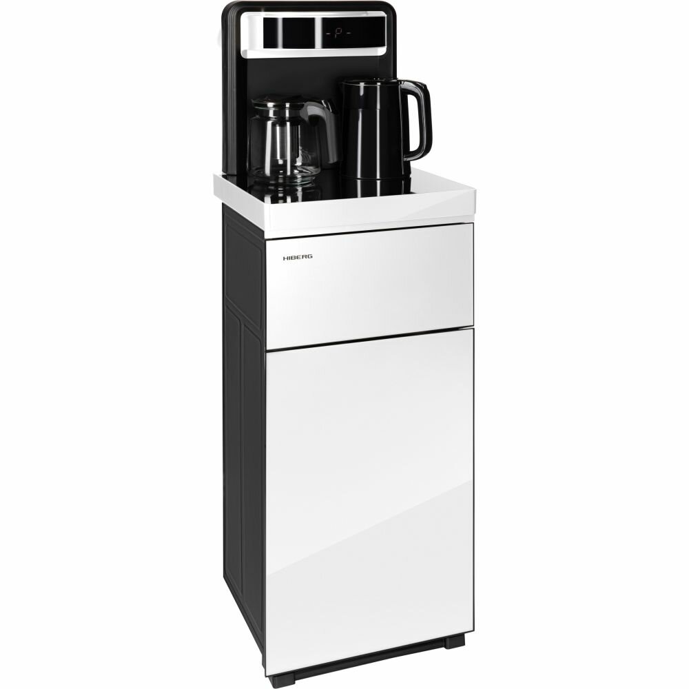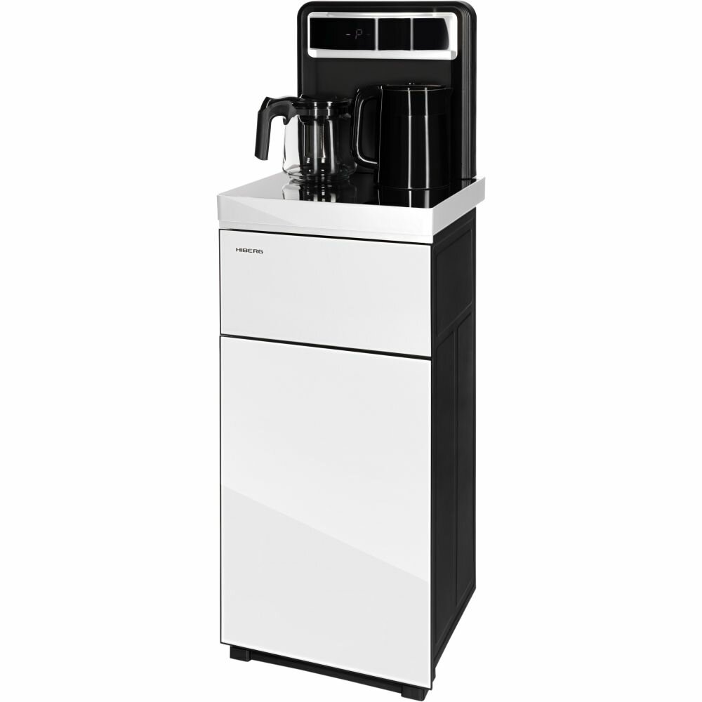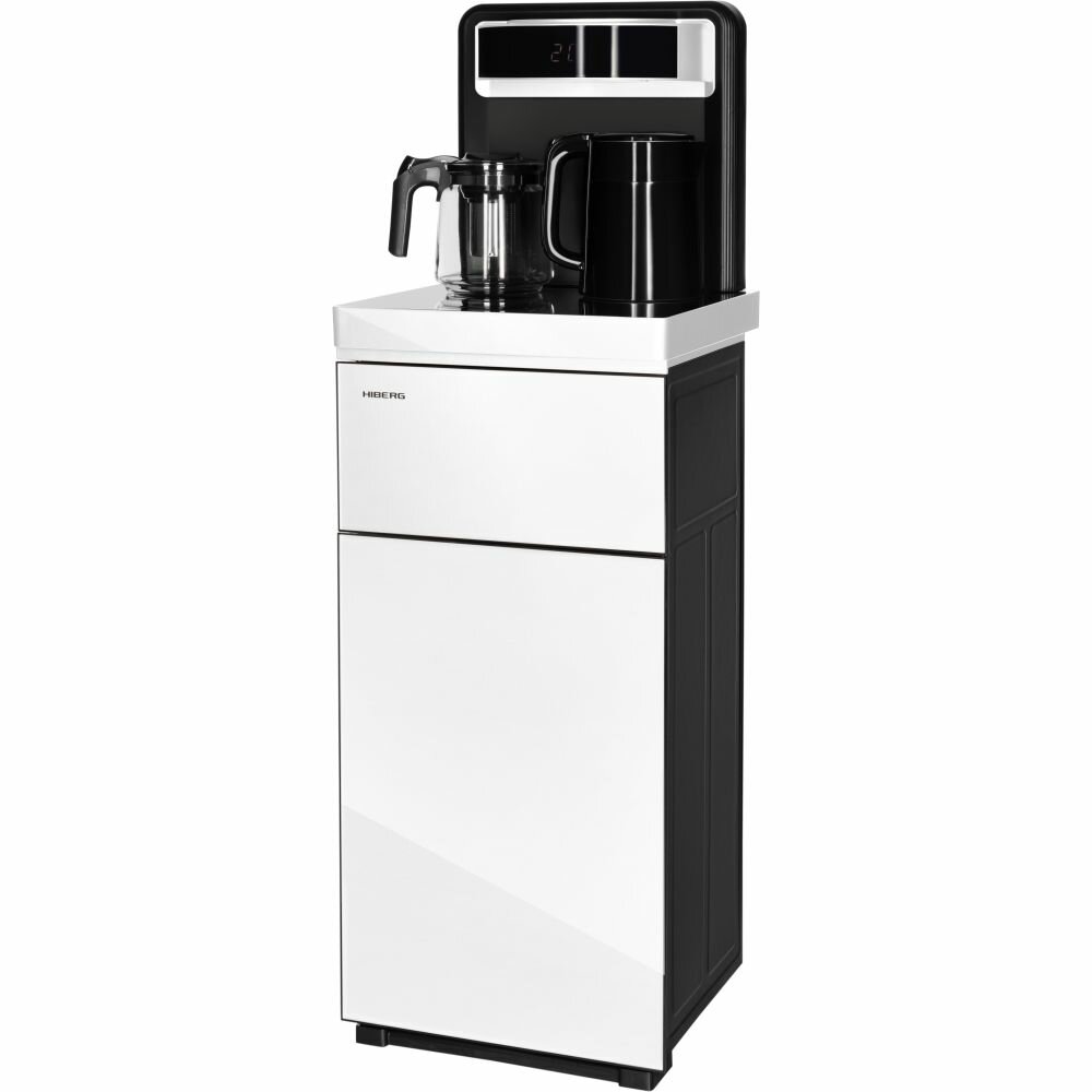 Купить Кулер для воды HIBERG UF 95 W напольный, электронное охлаждение, столешница с двумя чайниками, нижняя загрузка бутыли, сенсорное управление, цвет белое стекло
