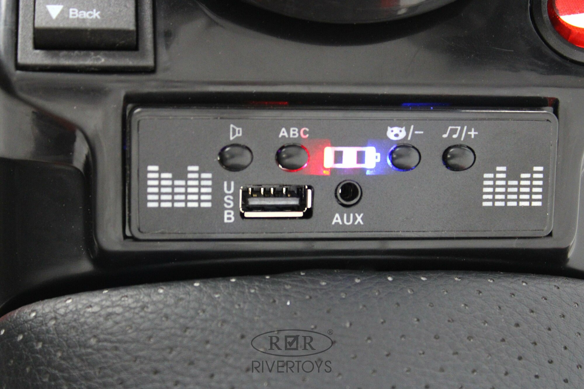 | Дополнительная информация | Световые эффекты: фары передние. Звуковые эффекты: звук клаксона/заводские мелодии. Пульт управления: нет. Колеса: пластиковые. Скорость: вперед/стоп/назад, 2-3,5 км/ч Сидение: эко-кожа. Включение: кнопка. Медиа-панель: USB, AUX, индикатор заряда батареи. |