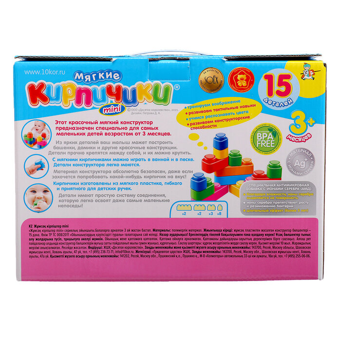 Кирпичики мягкие мини. Конструктор из мягкого материала для самых маленьких 15 деталей