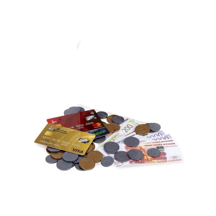 | Комплектация | копии монет (1, 2, 5, 10 руб.) – 80 шт, копии банкнот (50, 100, 200, 500, 1000, 2000, 5000 руб.) – 54 шт, копии банковских карт – 3 шт |
