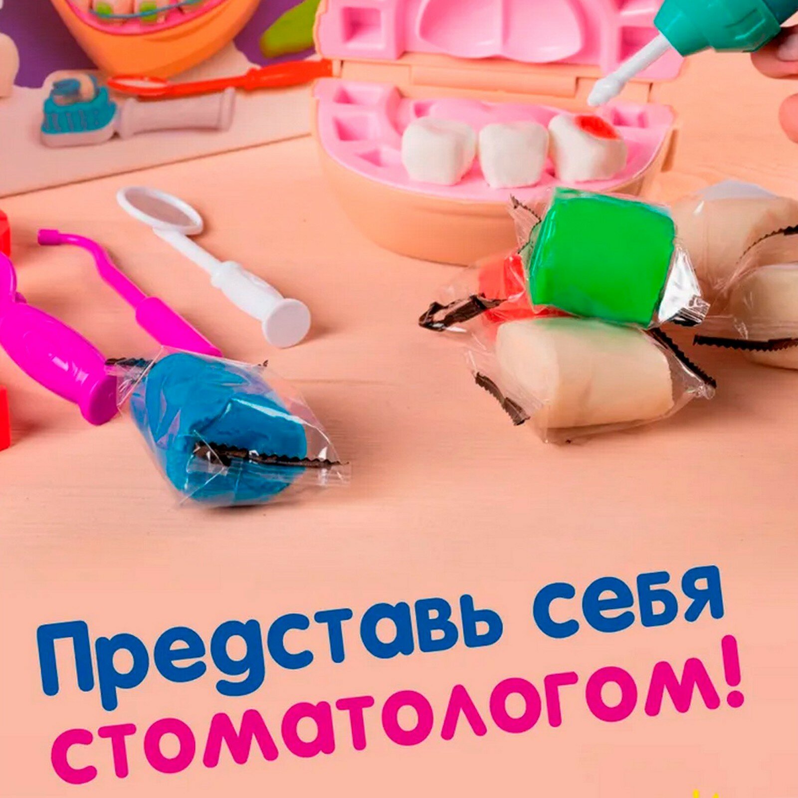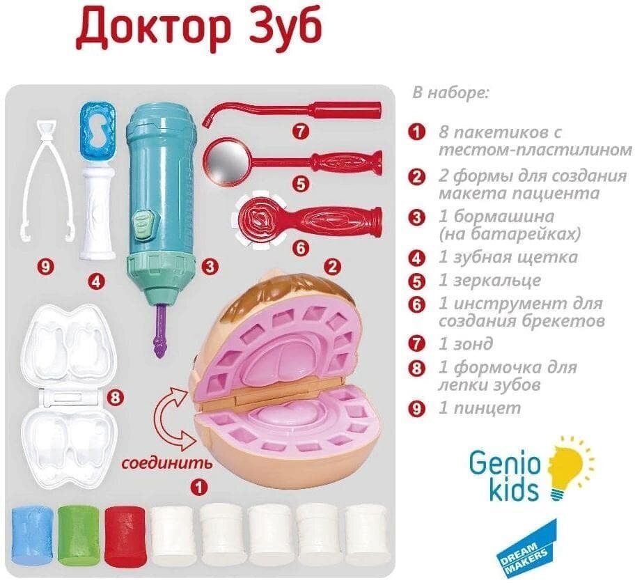| Комплектация | тесто-пластилин / инструменты для лепки / бормашина / формы для создания макета пациента / зубная щетка / пинцет / зеркальце / инструмент для создания брекетов / зонд / формочка для лепки зубов |