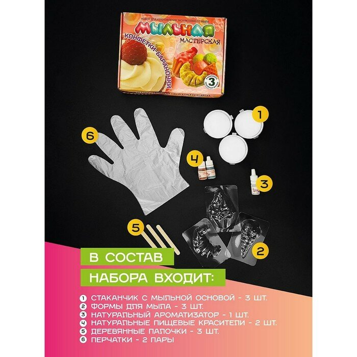 | Комплектация | стаканчик с мыльной основой 3 шт, формы для мыла 3 шт, натуральный ароматизатор 1 шт, натуральные пищевые красители 2 шт, деревянные палочки 3 шт, перчатки 2 пары. Инструкция указана на коробке. |