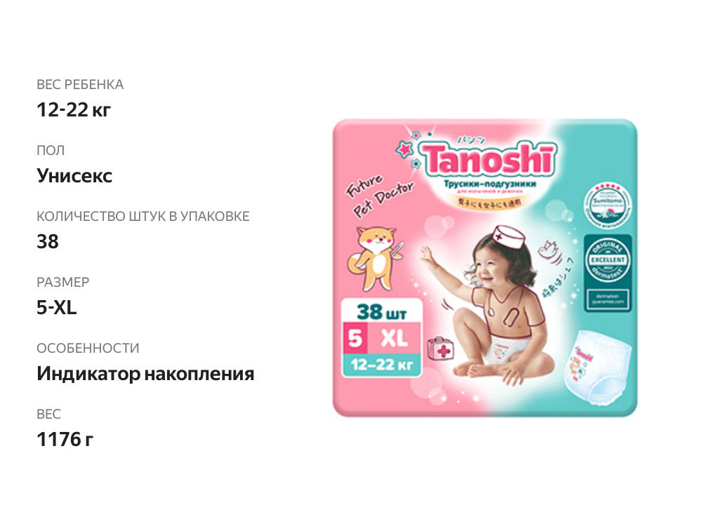 Трусики-подгузники для детей Tanoshi размер XL 12-22 кг, 38 шт интересное: