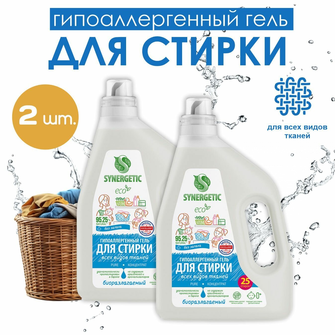| Подробная комплектация | Гель для стирки всех видов тканей SYNERGETIC Pure 1,5 л - 1 шт. |