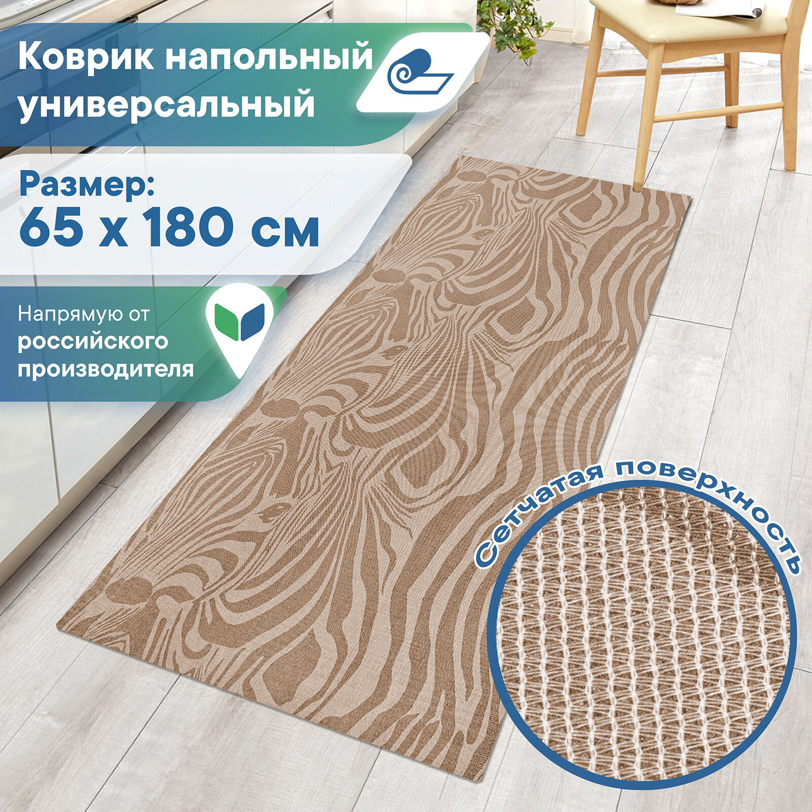 СохранитьКоврик дорожка напольный VILINA противоскользящий мягкий безворсовый в прихожую в комнату в коридор на кухню 65х180 см. "Элемент" коричневый зебра интересное: