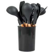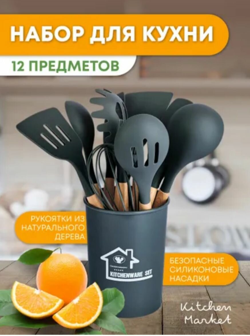 Кухонный набор Kitchen Set силикон и бамбук из 12 шт / цвет темно серый.