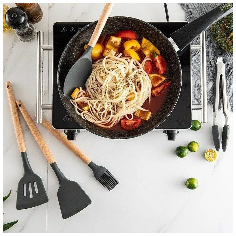 Набор кухонных принадлежностей из силикона и бамбука, 12 предметов "Kitchen set", серый
