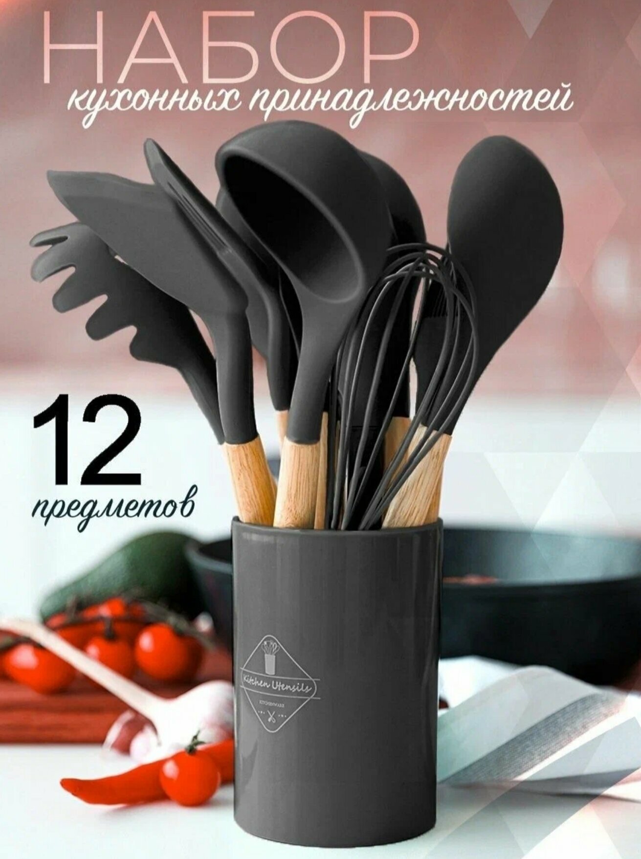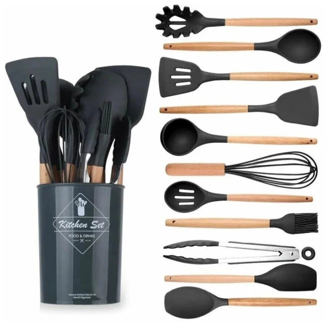 Кухонный набор Kitchen Set силикон и бамбук из 12 шт / цвет темно серый.