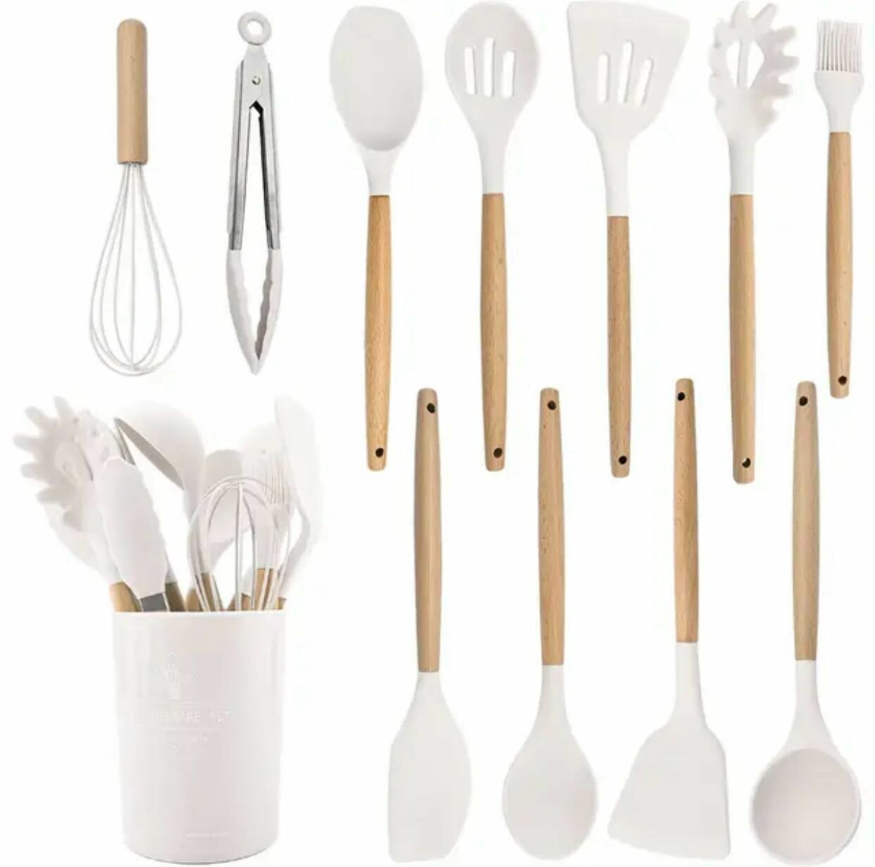 Купить Кухонный набор Kitchen Set силикон и бамбук из 12 шт / цвет белый (Айвори).