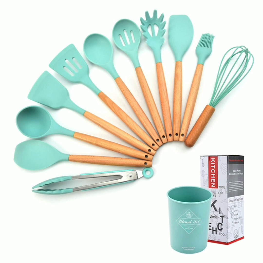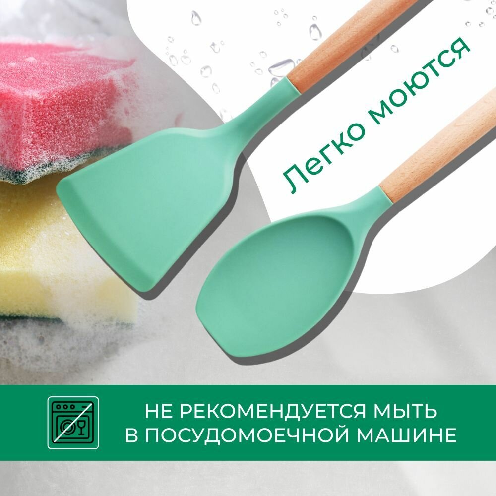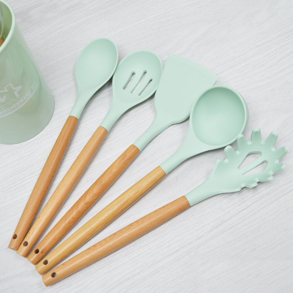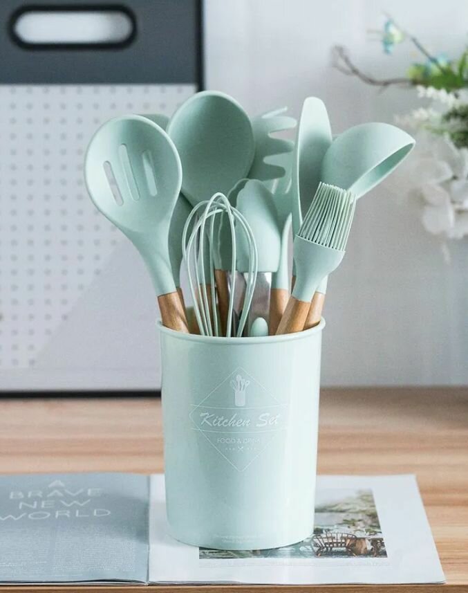 Кухонный набор Kitchen Set силикон и бамбук из 12 шт / цвет мятный.